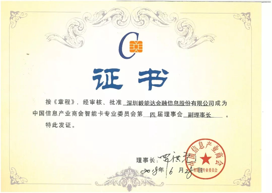 好消息!近日,深圳毅能達金融信息股份有限公司(以下簡稱“毅能達”)成功當選為中國信息產業商會智能卡專業委員會第四屆理事會副理事長。