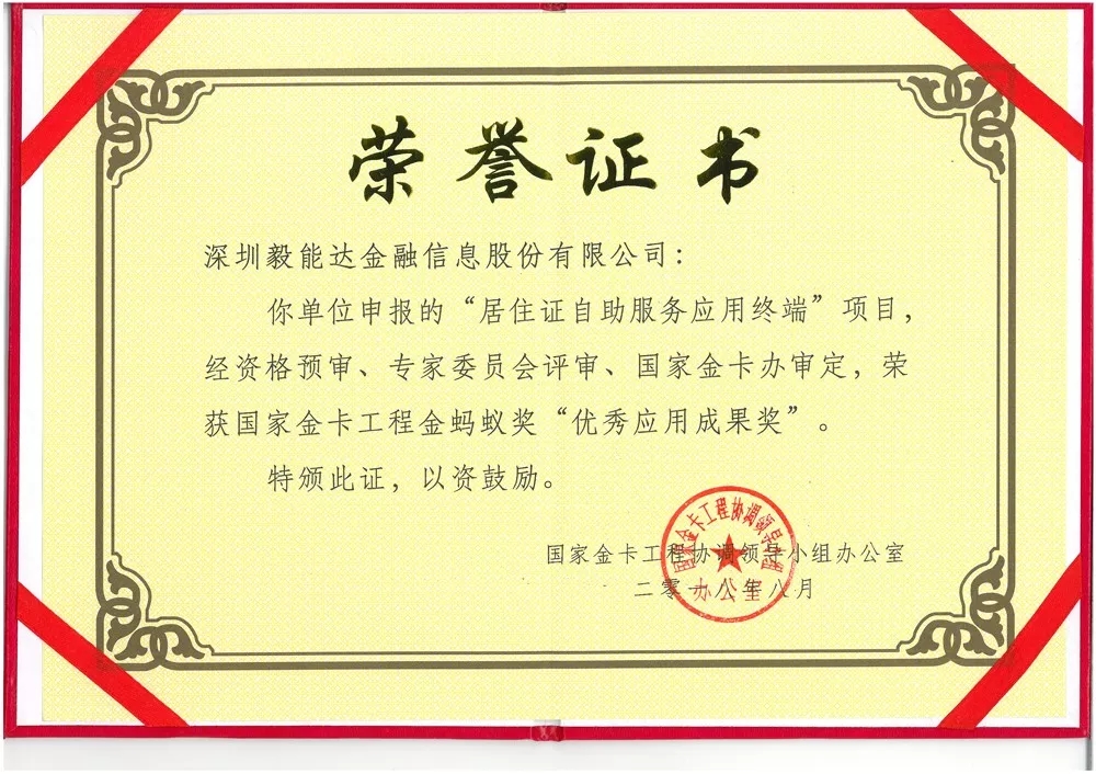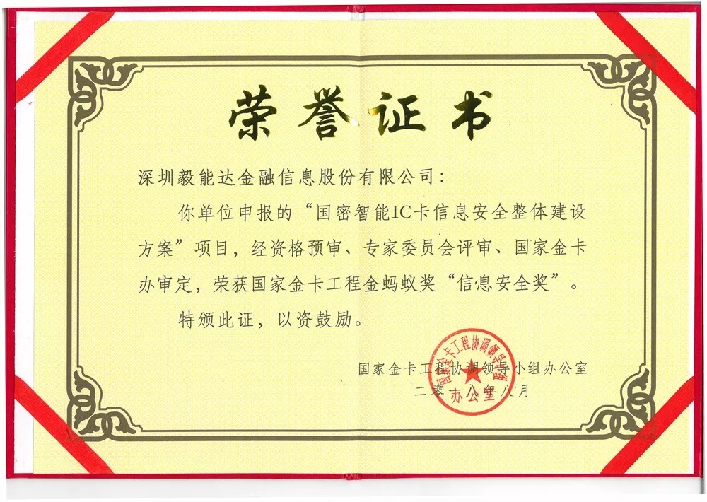 2018年12月20日,由國家金卡工程協調領導小組辦公室主辦的“國家金卡工程二十五年成果報告會”在中國科技會堂隆重開幕。會議現場頒發了“金螞蟻”獎項,深圳毅能達金融信息股份有限公司(以下簡稱“毅能達”)斬獲了兩項大獎:“信息安全獎”和“優秀應用成果獎”。