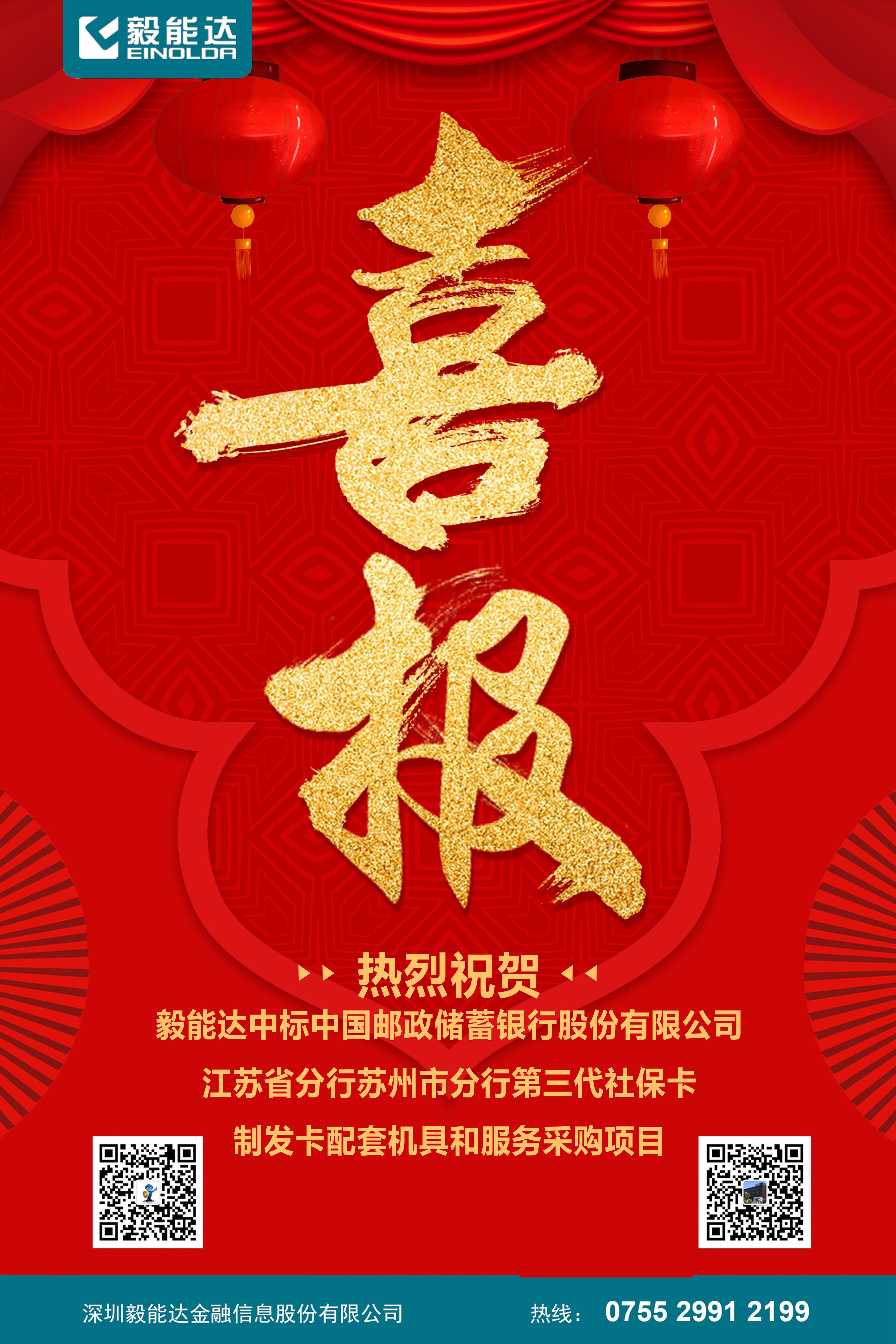 喜報!毅能達中標中國郵政儲蓄銀行股份有限公司江蘇省分行蘇州市分行第三代社??ㄖ瓢l卡配套機具和服務采購項目