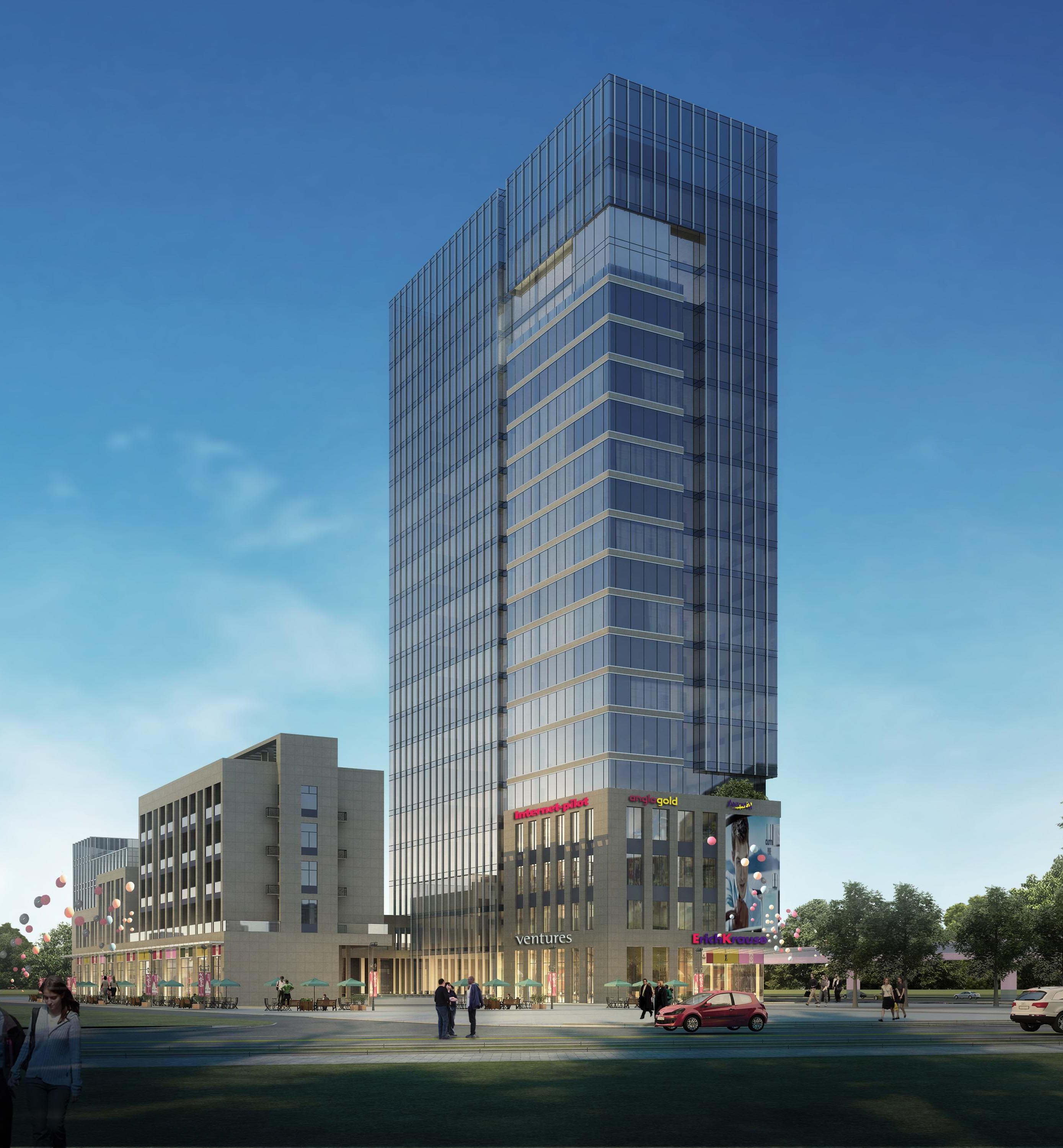 大樓設計建筑特征突破傳統建筑立面設計的模式,以挺拔向上為主導思想,著重強調豎向線條與玻璃幕墻的結合,為避免立面呆板缺少變化,引入造型凹槽將整個立面進行黃金分割,分割成為兩個豎向立面體塊,將本來厚重的立面化為輕盈。塔樓豎向桿件線條以向上的延展趨勢,同時在夜間通過燈柱本身的熒光,體現出一種高尚富麗的貴族氣質,大大提高企業昭示效果。